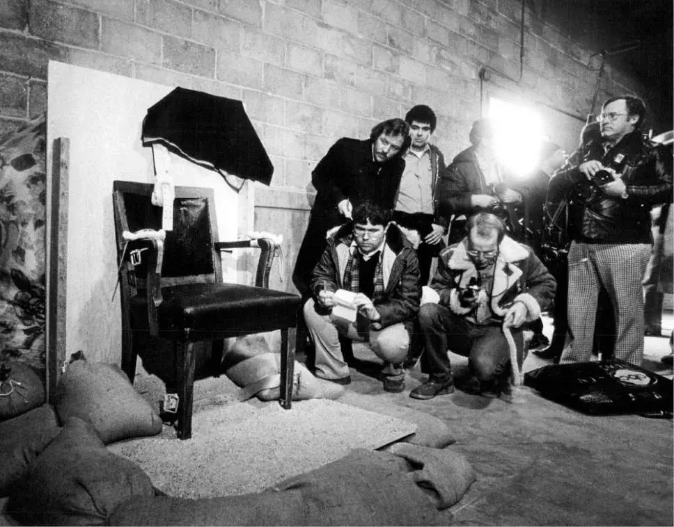 De medianoche al amanecer, 17 de enero: Aislamiento y preparaciónAlrededor de la medianoche terminó la fiesta; Gilmore fue trasladado a una celda de detención cerca del lugar de ejecución: una fábrica de conservas abandonada. Dormía a ratos y se despertaba para tomar café y fumar cigarrillos. A las 5:00 a. m., el padre Meersman nos visitó nuevamente para confesarse y comulgar. Las últimas palabras de Gilmore para él: “Dominus vobiscum” (El Señor esté contigo). Vestido con pantalones negros y camiseta blanca, lo ataron a una silla de madera a las 7:40 a.